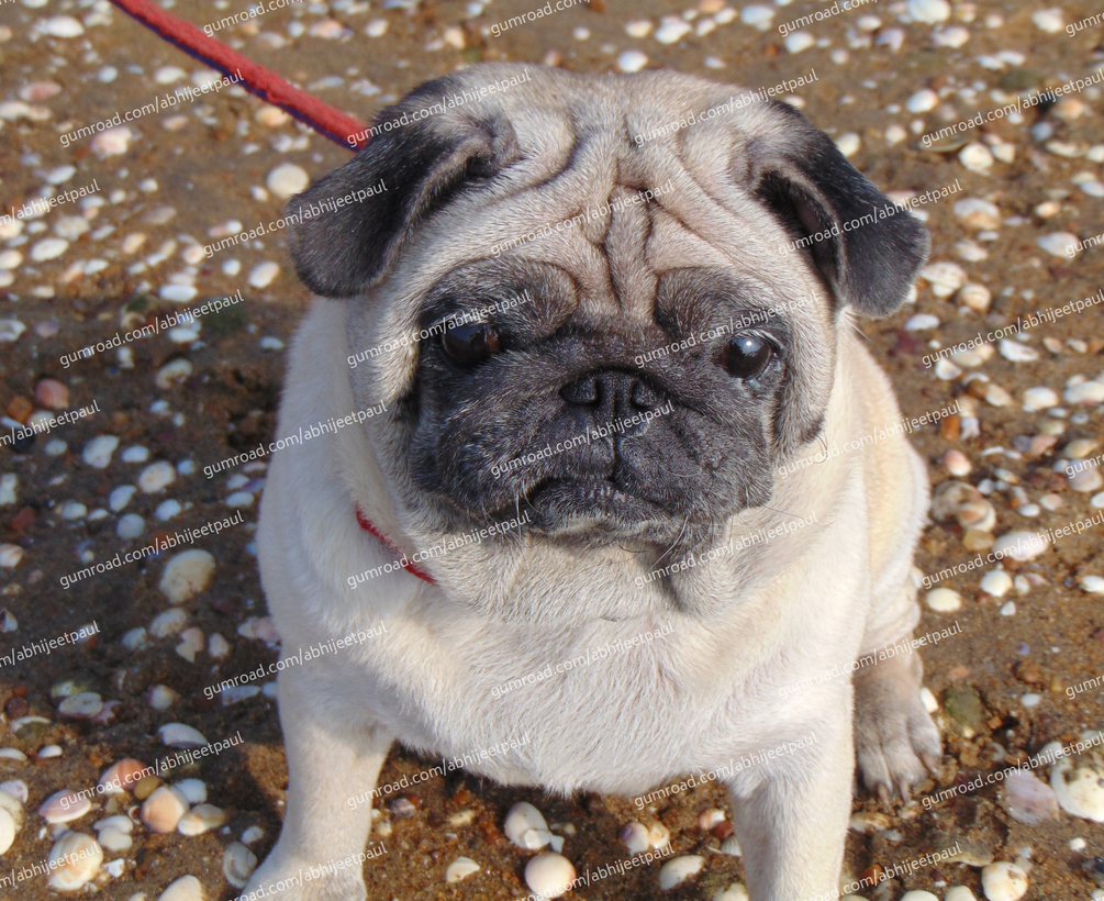 A digital photograph of my slightly irritated pug on the beach. Resolution: 4728x3864